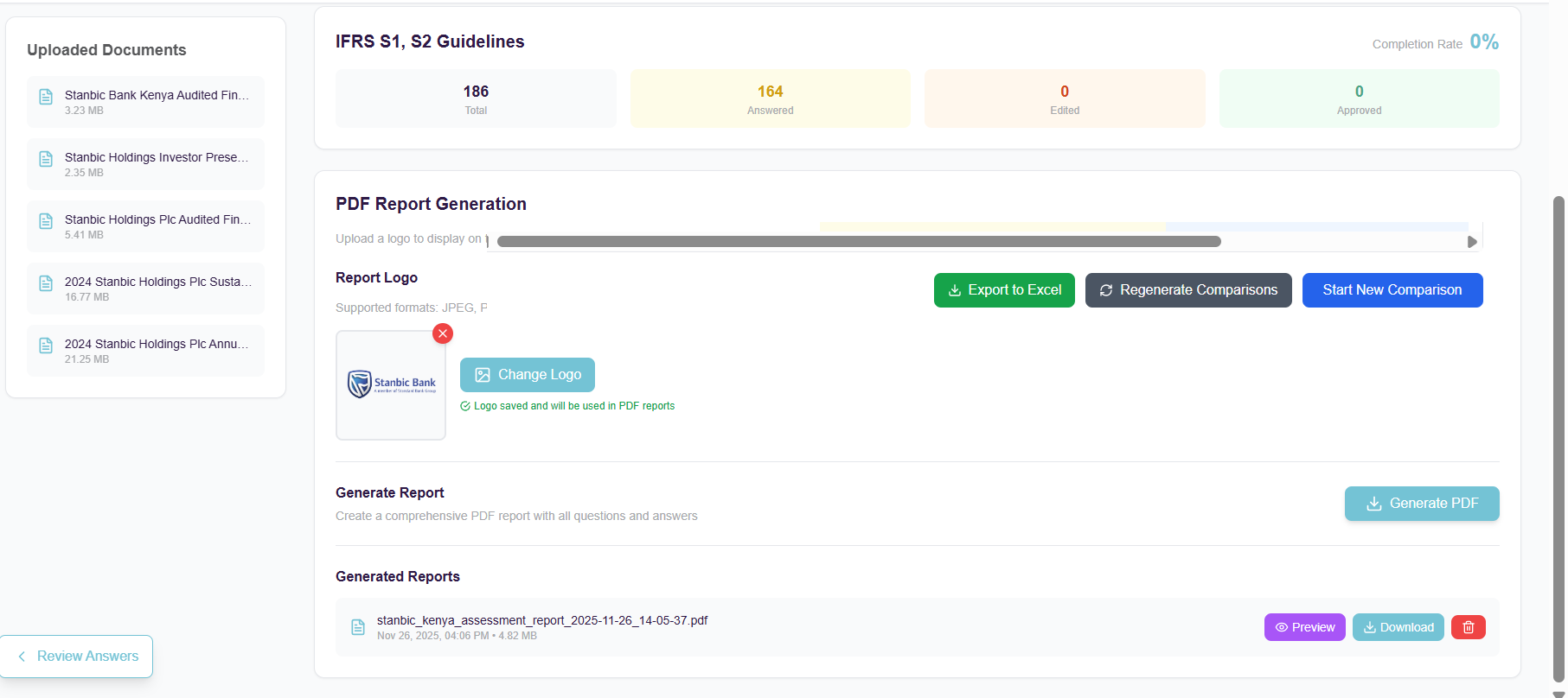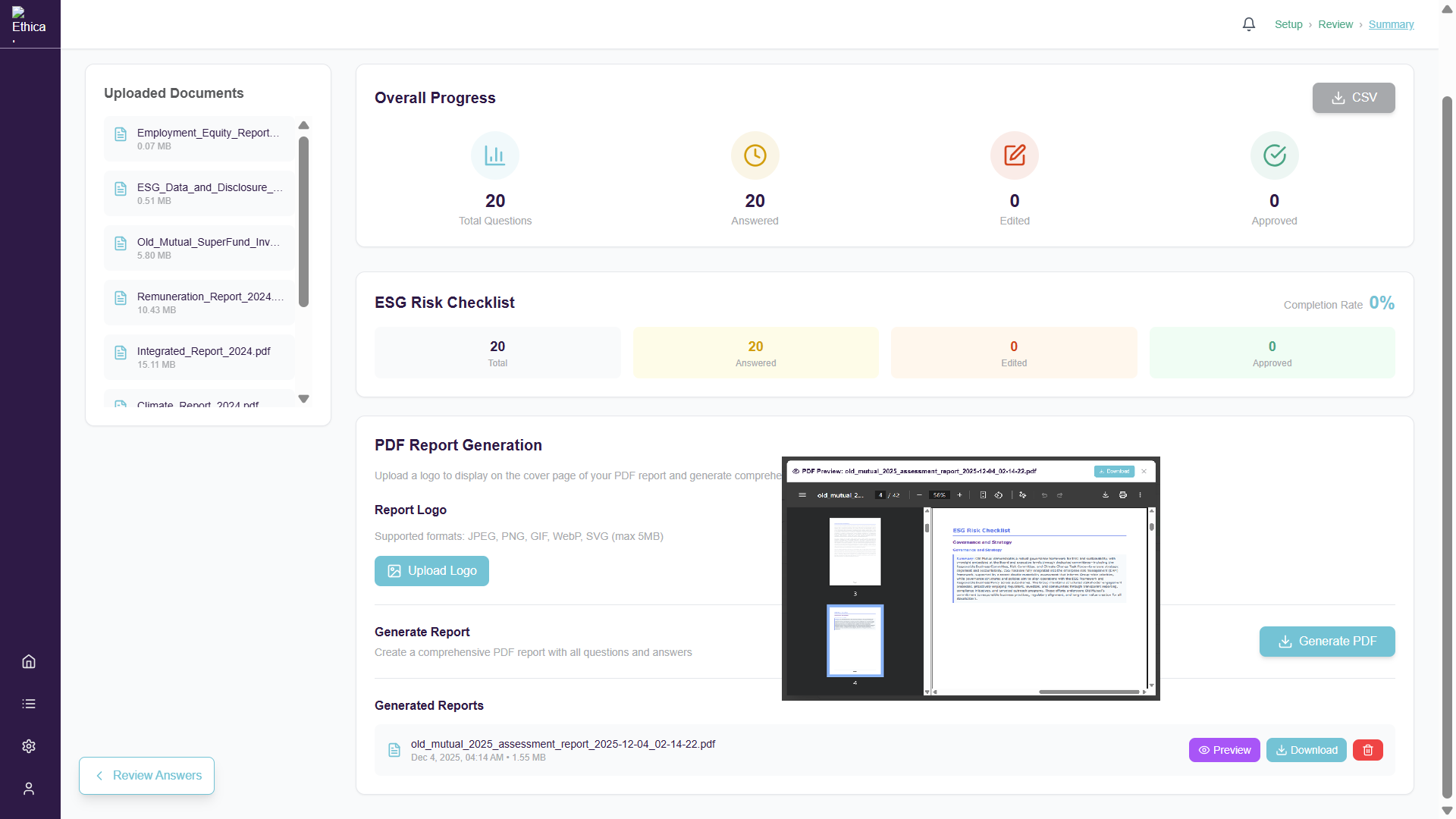 Produce polished reports including executive summaries, narrative explanations and framework alignment, or download your question and answer set in an editable CSV format.