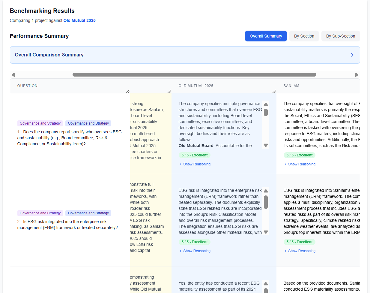 Choose peer organisations and let EASGeniusAI benchmark your ESG disclosures. Identify strengths, gaps and overall AI generated scoring in comparison with your selected peers.