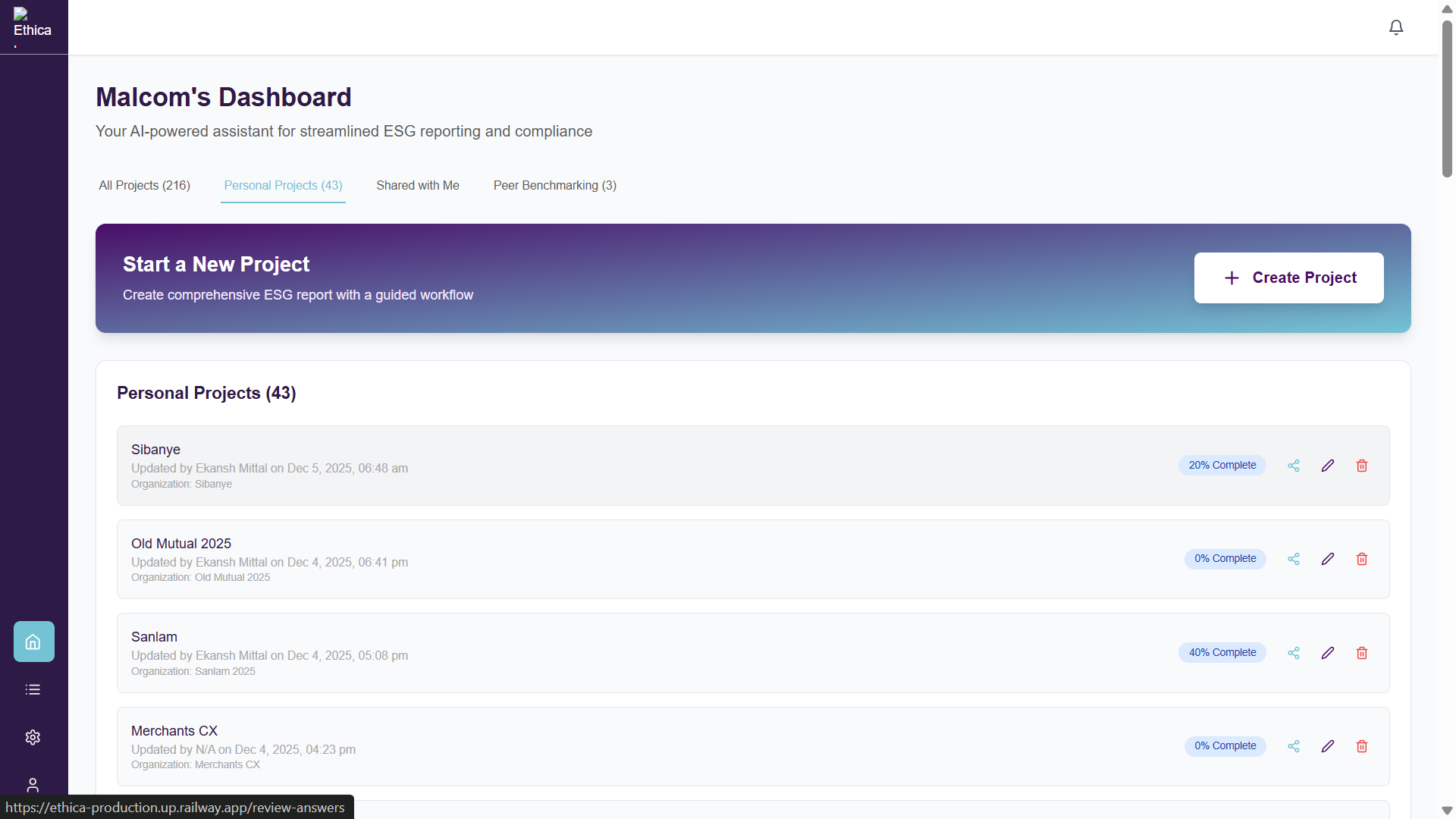 Create your ESG project for a reporting cycle, assurance process, lender questionnaire or internal review in one structured workspace.
