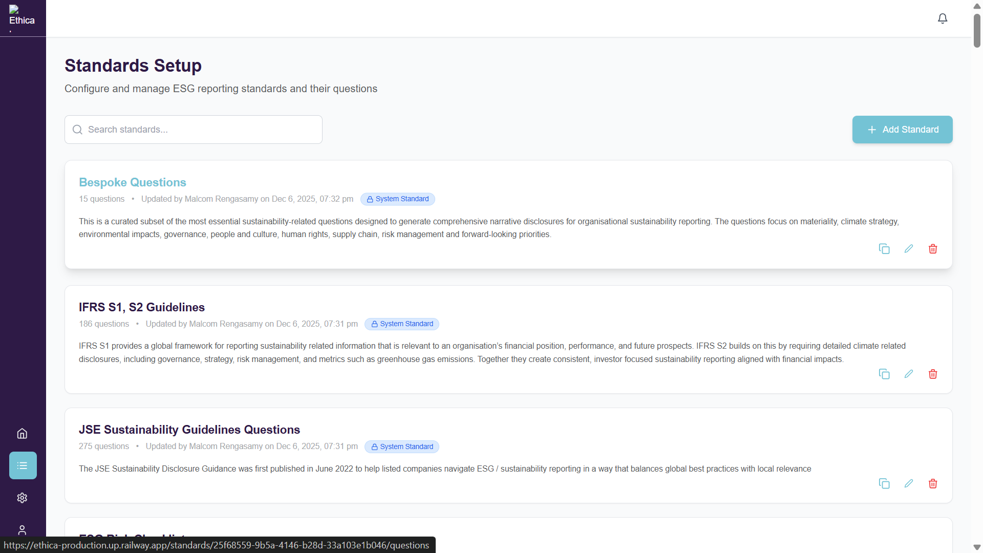 Start with your standard or question list, whether bespoke or aligned to IFRS S1, IFRS S2, ESRS or other frameworks.