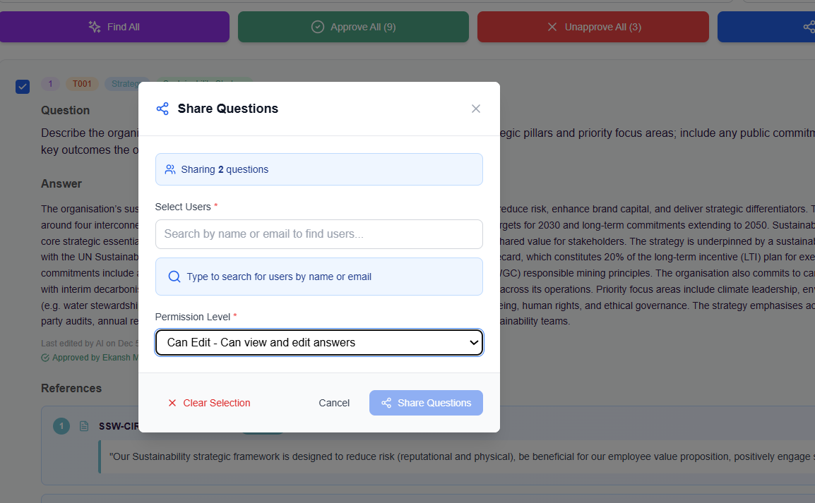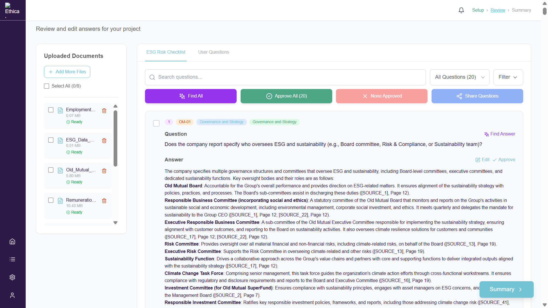 Upload reports, policies and data files, and generate AI driven responses automatically referenced to your uploaded sources, with editing and approval functionality where required.